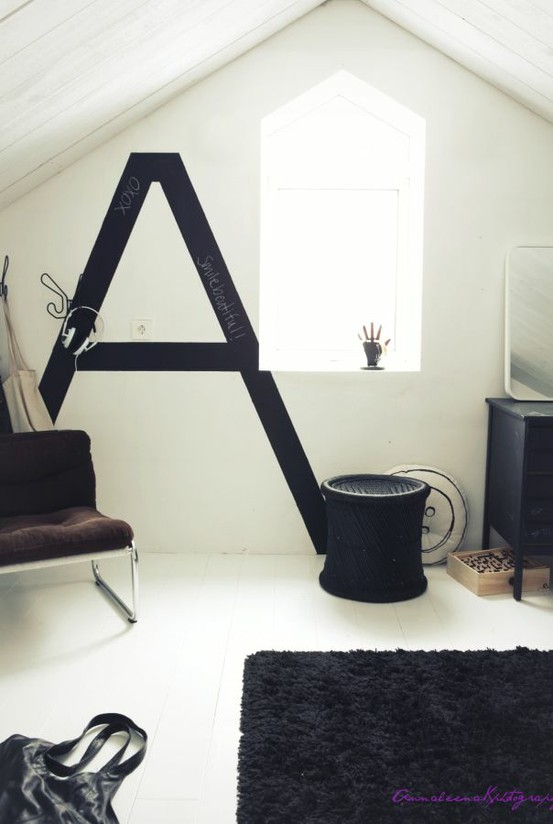Do niedawna kojarzyła się tylko ze szkołą podstawową i niezbyt atrakcyjnymi szyldami z menu. Czarna tablica w różnych wersjach stała się użytecznym/modnym/typograficznym elementem wielu współcześnie projektowanych wnętrz. Odwiedzając blogi wnętrzarskie np. vosgesparis trudno oprzeć się wrażeniu, że farba tablicowa jest wszędzie. W zasadzie nie ma ograniczeń co do tego jak dana tablica (chociaż w zasadzie to już nie tablica a nieograniczona przestrzeń do pisania) ma wyglądać. Pełna dowolność gdzie może być zastosowana, daje duże możliwości. Dostępne są również folie o tych samych właściwościach co farba, np. do oklejania mebli.